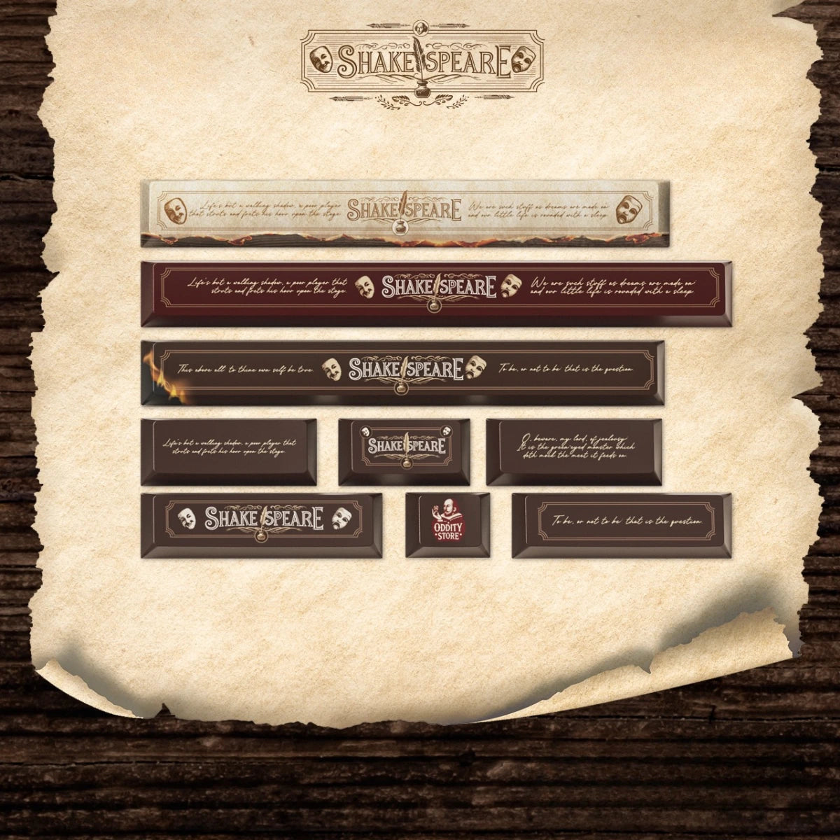 Each spacebar in the collection bears a famous line from Shakespeare’s plays, engraved with antique typography and framed by theatrical motifs.