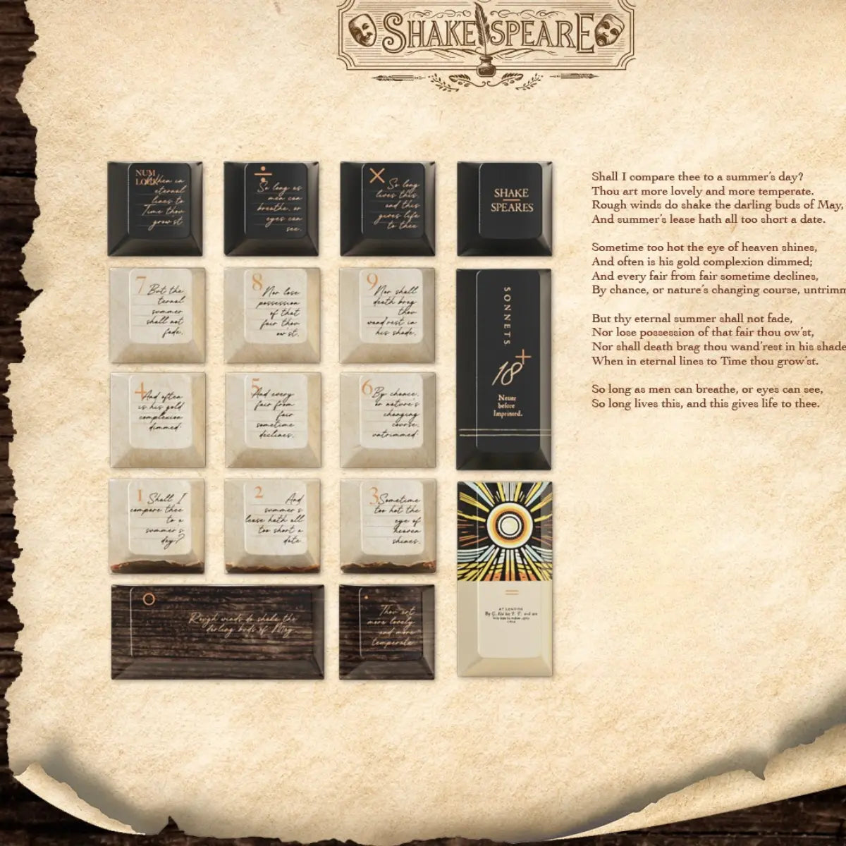 Inspired by Sonnet 18, one of Shakespeare’s most celebrated poems, this set engraves each verse onto individual keycaps, recreating the rhythm of his immortal words.